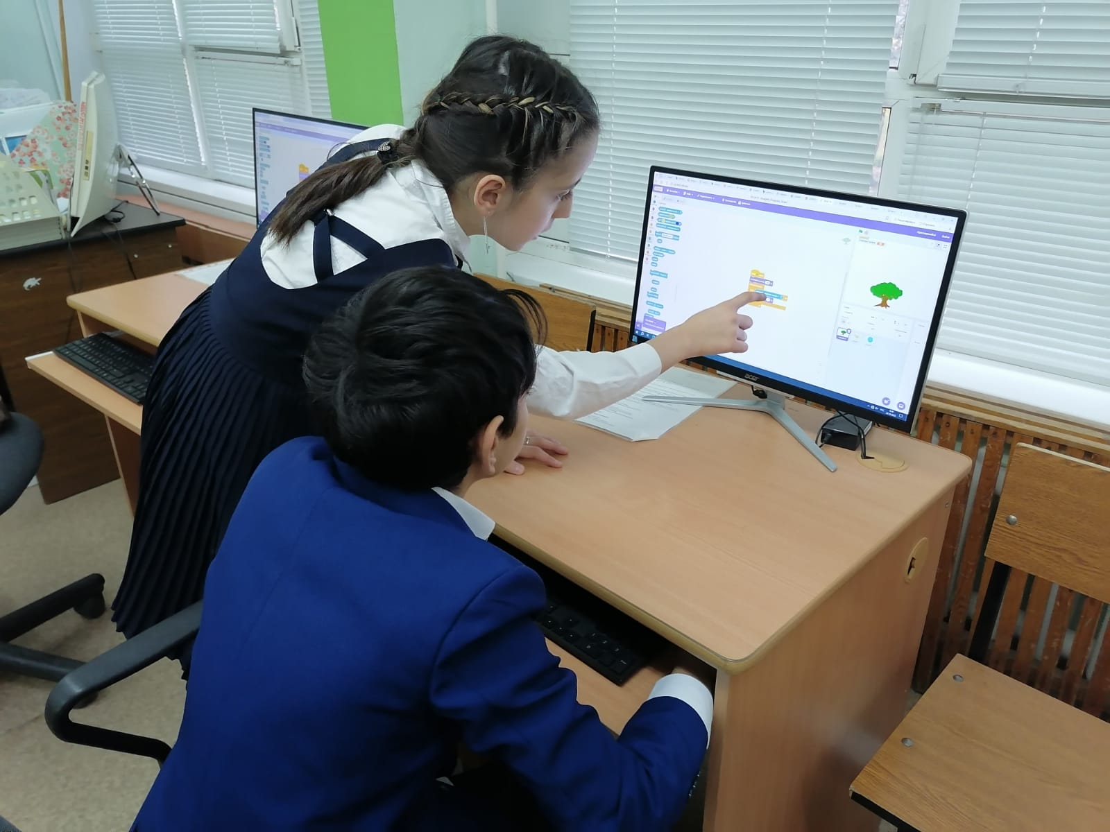 А на занятии у Кирилла Рифкатовича Загидуллина пятиклассники погрузились в азы программирования в визуальной среде Scratch. С помощью кода они «поливали» дерево из лейки, наблюдая, как оно растет и зеленеет прямо на экране.