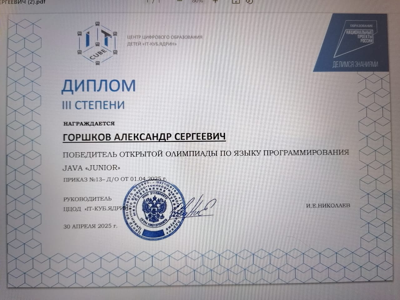 Поздравляем обучающегося ЦЦОД "IT-куб" Набережные Челны Горшкова Александра с дипломом III степени!