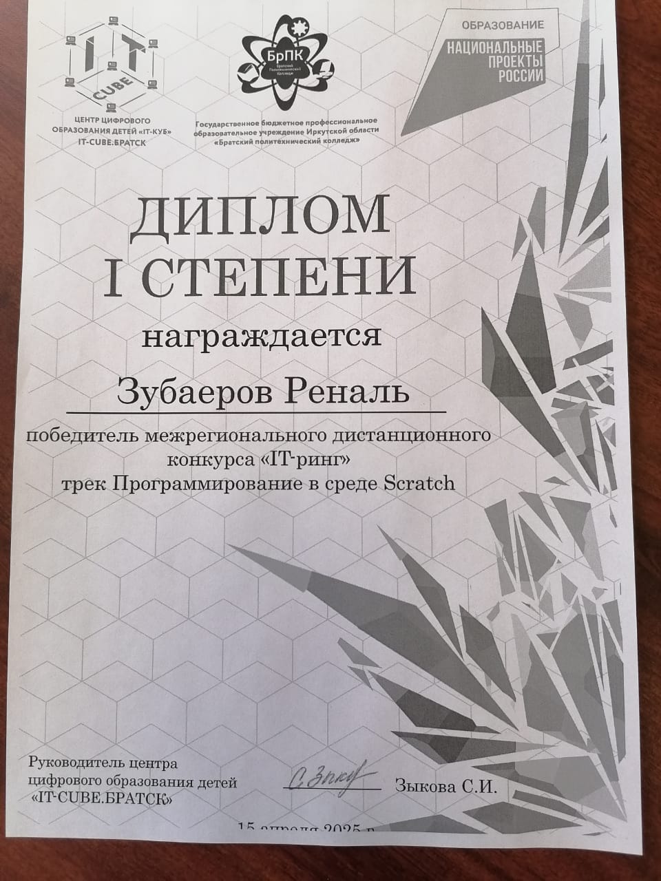 Он обучается в ЦЦОД "IT куб" при ГАПОУ "Набережночелнинский политехнический колледж". Реналь участвовал в Межрегиональном дистанционном конкурсе "IT-ринг", подготовленный коллегами из IT куб г. Братск. Организаторы прислали ему ДИПЛОМ I СТЕПЕНИ и поблагодарили за интересную и творческую работу.